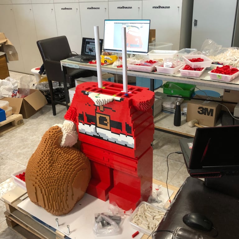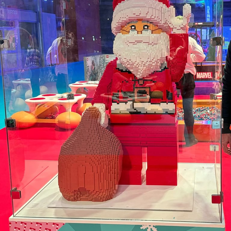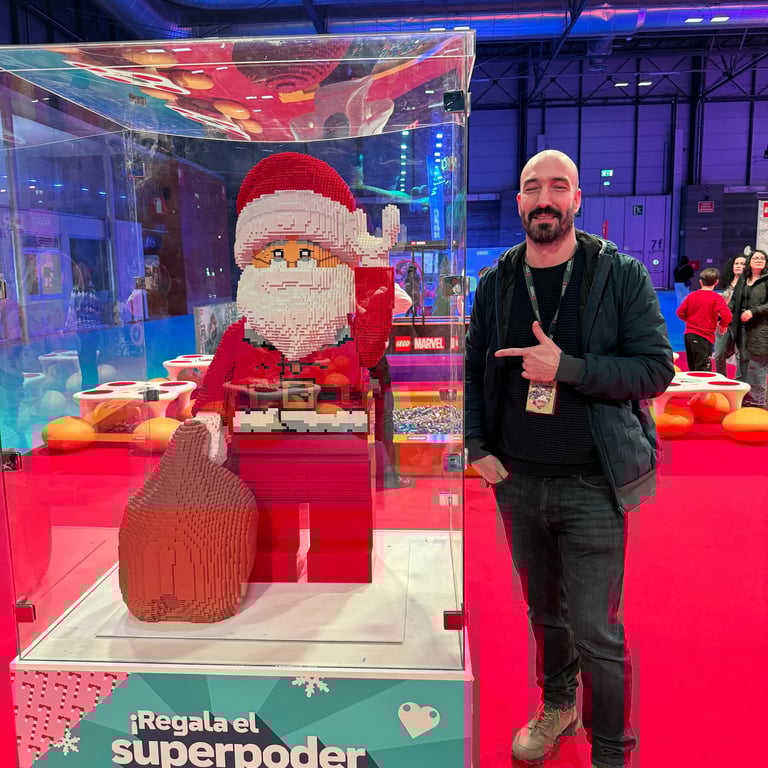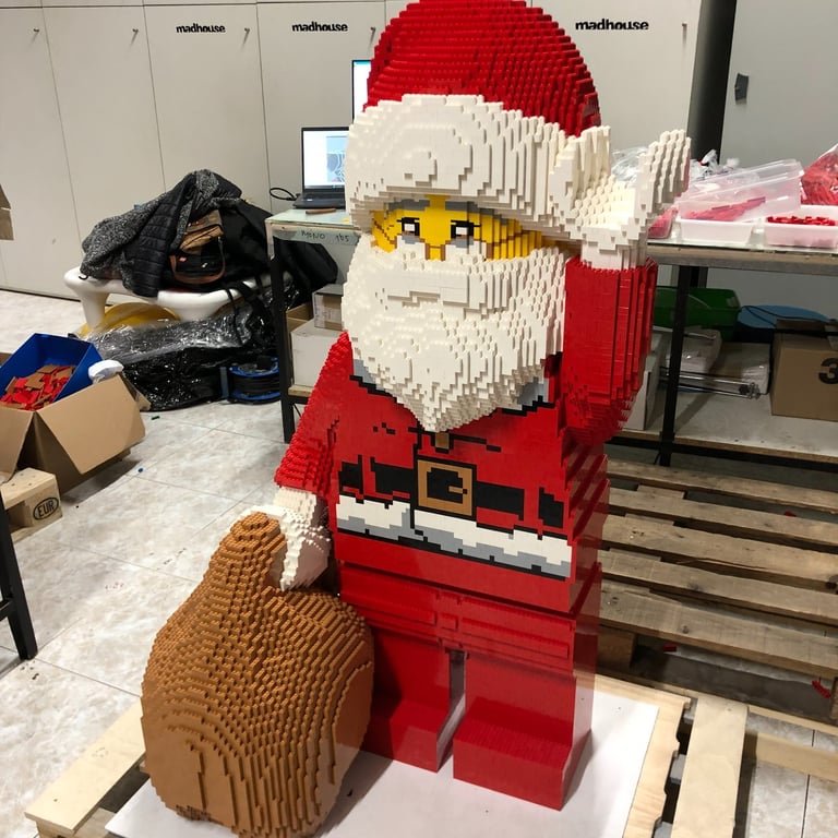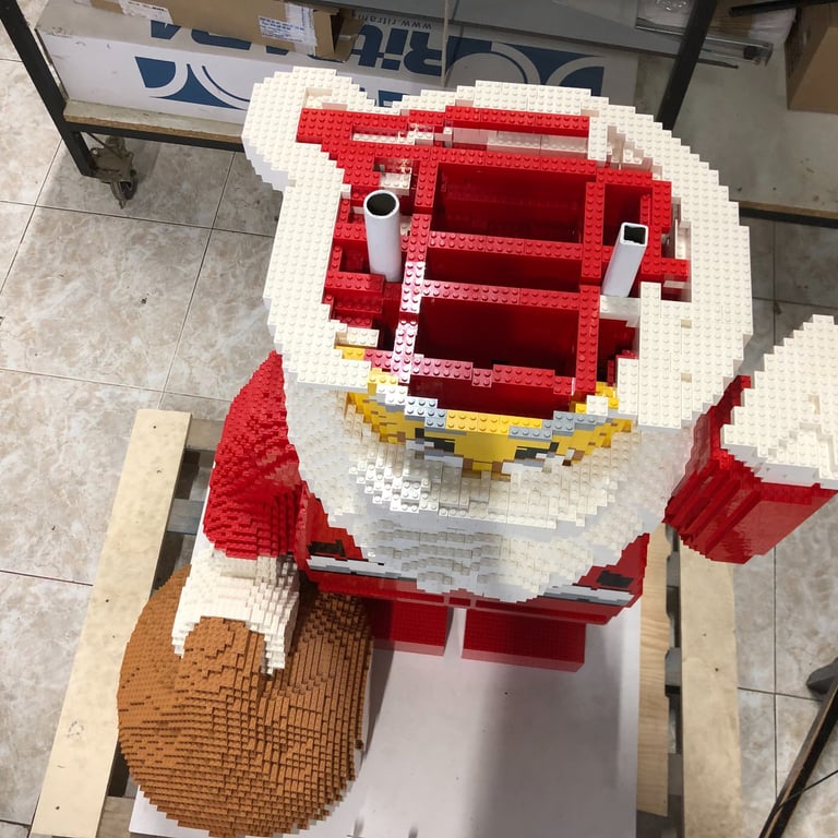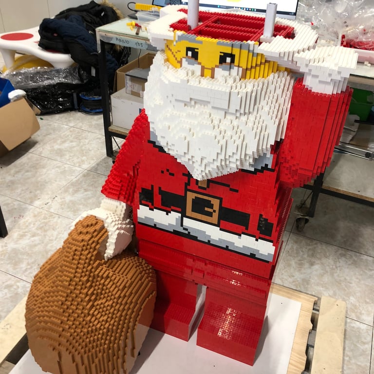 Este modelo es una recreación de una minifigura LEGO® de Papá Noel, diseñada para el evento Juvenalia en IFEMA (Madrid) durante las Navidades de 2023.